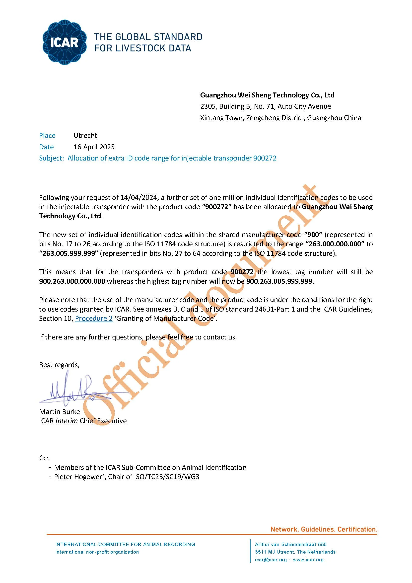 Certificado ICAR de 15 dígitos (ejemplo: 9002630000000001)
