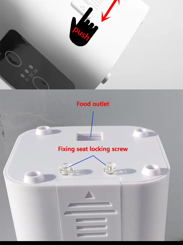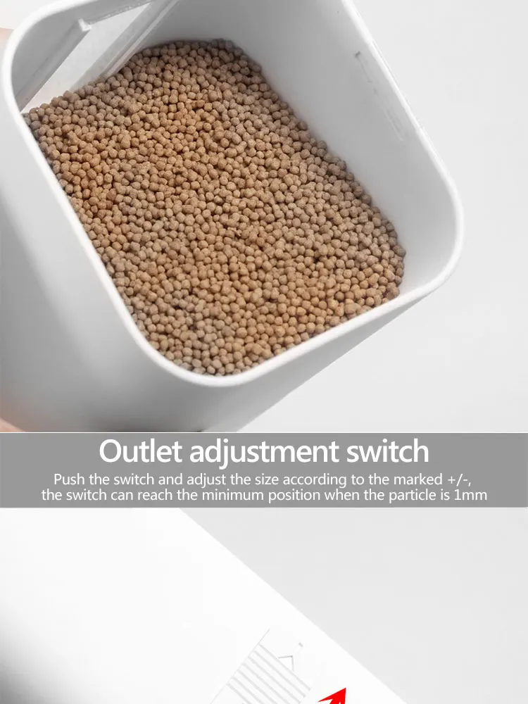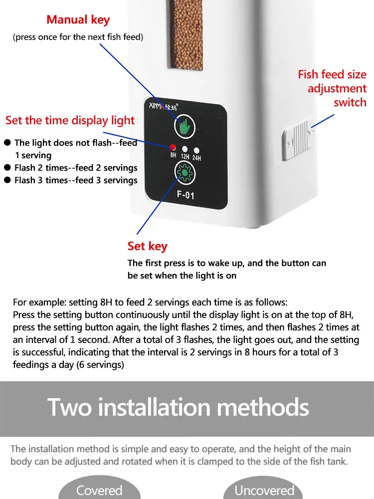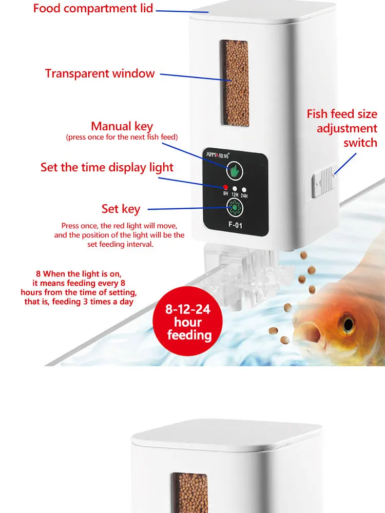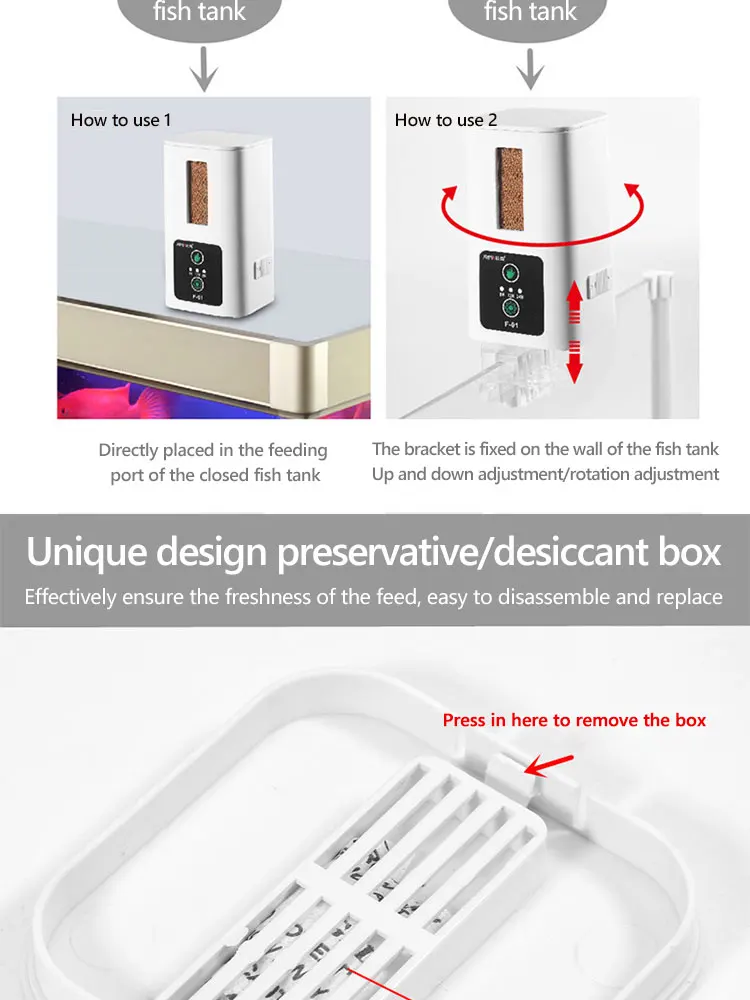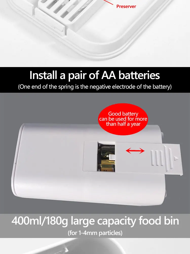 Este comedero tiene capacidad para 400 ml/180 g de alimento en pellets para diámetros de ∮1-4 mm. Se mantiene cerrado cuando no está en funcionamiento, lo que evita eficazmente que el alimento recupere humedad y se aglomere. Su nuevo diseño de estructura genera un bajo nivel de ruido y es adecuado para diversas instalaciones de acuarios. Puede administrar de 1 a 3 raciones por periodo para satisfacer las diferentes necesidades de consumo de alimento.