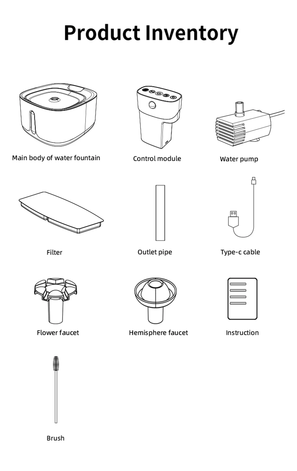 Host, main control module, filter, water pump, type-c charging cable, brush, instruction manual |